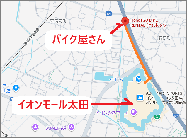 太田駅前からイオンタウン太田まではバスが出ており(約15分乗車、運賃180円)、そこから先は歩いて5~10分程でバイク屋さんに着きました。
